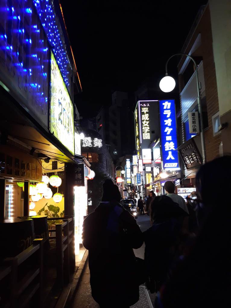 Esa parte de Tokio es preciosa, y no lo digo por los japoneses guapos que nos encontrábamos al caminar, sino por los altos edificios, que, aunque también hermosos, no eran nada parecidos a los de Akihabara. Era una belleza distinta, más seria, más nocturna, más de fiesta. En nuestras caminatas de vez en cuando nos topábamos con esos callejoncitos que sabes que existen en Tokio pero que no se les da mucha importancia. Pequeños, acogedores, llenos de luces y promesas mágicas.